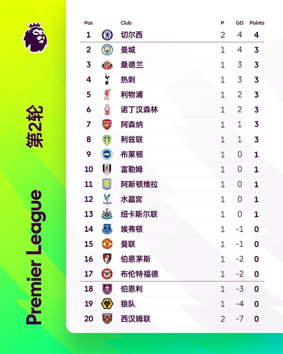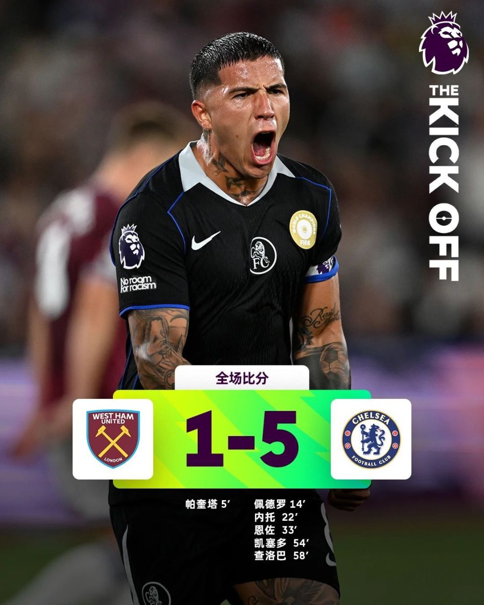 英超第2轮首场比赛结束;西汉姆联1-5切尔西。